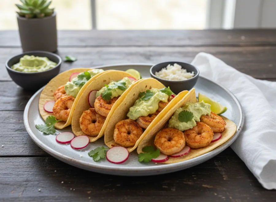 While the shrimp cook, prepare your taco toppings: shred cabbage, slice radishes, dice tomatoes, chop cilantro, and cut lime wedges. Arrange everything in small bowls for a taco bar–style setup.