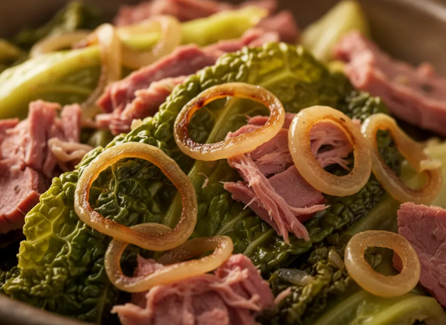 For Pinterest, overhead photos of the golden-brown corned beef nestled in tender cabbage with visible onions and herbs will perform extremely well in St. Patrick’s Day and Irish recipe feeds.